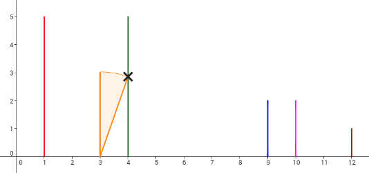 Дано n доминошек на плоскости с декартовой системой координат. i-ю доминошку (1 ≤ i ≤ n) можно представить как параллельный оси y отрезок длины li. Нижняя точка отрезка находится на оси x. Обозначим x-координату i-й доминошки как pi. Доминошки ставятся друг за другом, таким образом, выполняется условие p1 < p2 < ... < pn - 1 < pn.