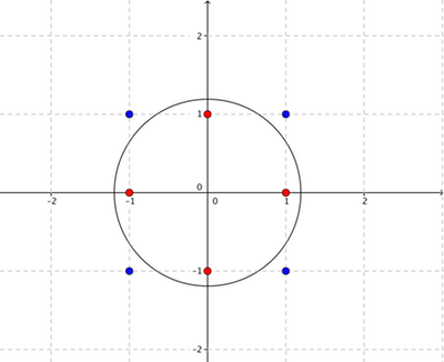 В первом примере не существует способа разделить точки окружностью, так как любой круг, который содержит обе точки ( - 1, 0), (1, 0), так же содержит хотя бы одну точку из множества (0, - 1), (0, 1), и наоборот: любой круг, который содержит обе точки (0, - 1), (0, 1), так же содержит хотя бы одну точку из множества ( - 1, 0), (1, 0)