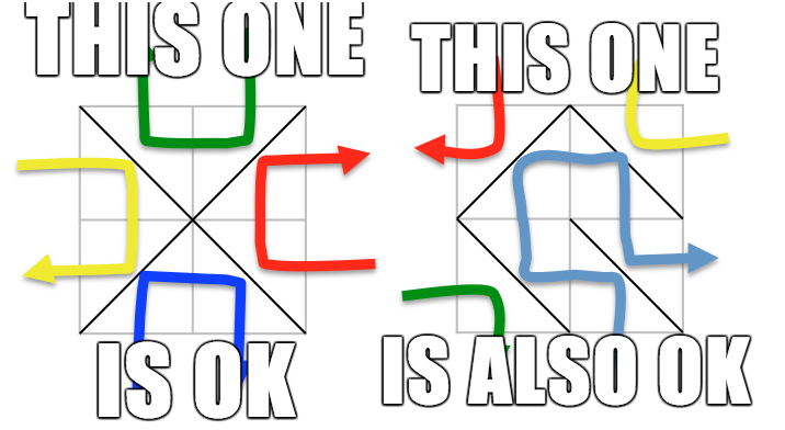 - Если пустить луч света горизонтально/вертикально в середину любого единичного отрезка, являющегося стороной некоторой граничной ячейки, то луч света выйдет из одноги из соседних с ним единичных отрезков.