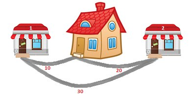 Патрик всегда стартует дома. Он должен посетить оба магазина, перемещаясь только по имеющимся трём дорожкам, и вернуться назад домой. При этом его совершенно не смутит, если ему придётся посетить один и тот же магазин или пройти по одной и той же дорожке более одного раза. Единственная его задача — минимизировать суммарное пройденное расстояние.