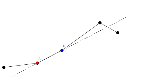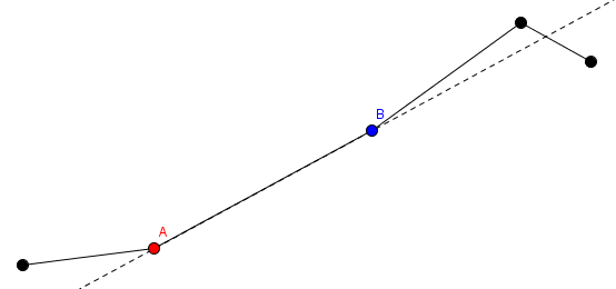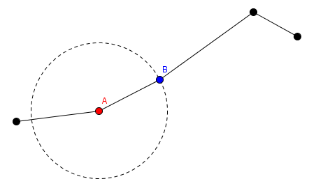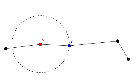 На этой иллюстрации красный конец помечен А, а отрезки до А остаются на местах, в то время как синий конец помечен как B и отрезки после В повернутся вокруг точки А.