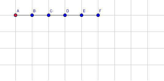 Следующие картинки иллюстрируют пример и показывают состояние руки после каждой операции. Координаты точки F выведены после применения каждой операции. Для простоты мы показываем только синие концы отрезка (за исключением красного конца первого). Например, точка, помеченная В, является синим концом отрезка 1, а также красным концом отрезка 2.