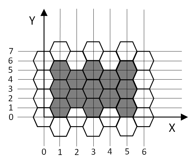 Более формально, если гейм-дизайнер выбрал соты с координатами (x1, y1) и (x2, y2), где x1 ≤ x2 и y1 ≤ y2, то заполняются все соты с координатами центров (x, y), такие что x1 ≤ x ≤ x2 и y1 ≤ y ≤ y2. Прямоугольная система координат введена таким образом, что одна из сторон сот параллельна оси OX, все центры шестиугольников имеют целочисленные координаты, для каждого целого x есть соты с центром с такой x-координатой и для каждого целого y есть соты с центром с такой y-координатой. Гарантируется, что разность x2 - x1 делится нацело на 2.