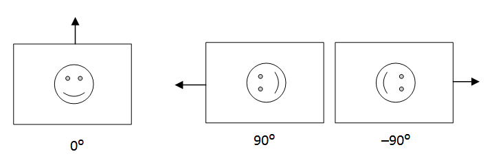 На следующем рисунке изображены кадры, полученные с не повёрнутой камеры, затем с повёрнутой на 90 градусов по часовой стрелке, затем с повёрнутой на 90 градусов в обратную сторону. Стрелками показано направление на «истинный верх».