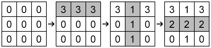 Принтер умеет печатать только на прямоугольных клетчатых листах размера n × m. Представим лист как таблицу, состоящую из n строк и m столбцов. Строки нумеруются сверху вниз целыми числами от 1 до n, а столбцы — слева направо целыми числами от 1 до m. Изначально все клетки таблицы покрашены в цвет 0.
