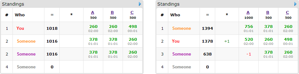 Ваше место в конце раунда будет определяться как один плюс количество участников, суммарный балл которых строго больше вашего суммарного балла.