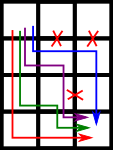 Рисунок изображает лабиринт с запертыми дверями. Разноцветные стрелки изображают всевозможные пути, а красный крест означает запертую дверь. Кодер ZS считает, что сложность лабиринта равна x, если существует ровно x способов пройти из комнаты (1, 1) в комнату (n, m). Два способа считаются различными если они различаются в последовательности посещенных в пути комнат.