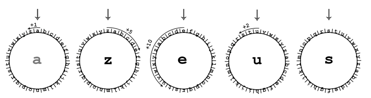 Эмбоссер представляет собой устройство для «печати» текста на пластиковой ленте. Текст набирается последовательно, буква за буквой. В устройство входят колесо с нанесёнными по кругу строчными буквами английского алфавита, неподвижная засечка, которая указывает на текущую букву, и кнопка, печатающая выбранную букву. За одно действие можно повернуть колесо с алфавитом на одну букву влево либо вправо по циклу. Изначально засечка эмбоссера указывает на букву a. Остальные буквы расположены так, как показано на рисунке.