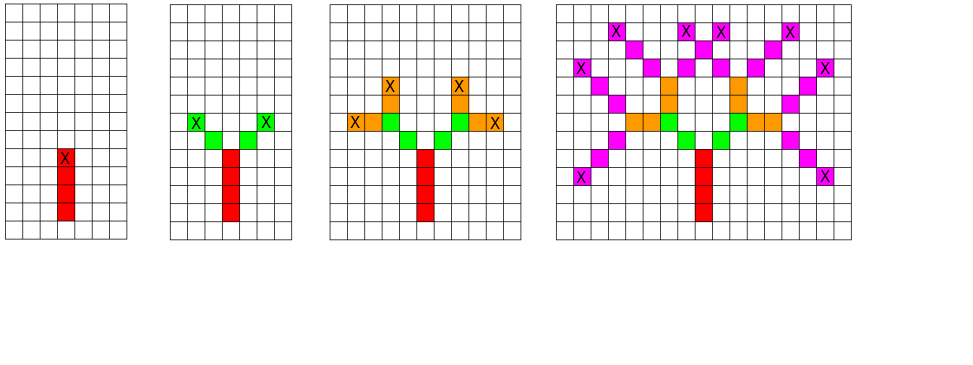 Рассмотрим первый пример. Рисунки ниже показывают как будет выглядеть процесс работы фейерверка после каждого уровня рекурсии. Лимак запускает фейерверк из самой нижней красной клетки. После прохождения t1 = 4 клеток (отмеченных красным) он взрывается и делится на две части (их дальнейшее движение показано зелёным). Все взрывы отмечены символом «X». На последнем рисунке присутствуют 4 красных, 4 зелёных, 8 оранжевых и 23 розовых клетки. Таким образом, итоговое количество посещённых клеток равняется 4 + 4 + 8 + 23 = 39.