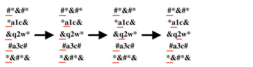 Для каждого символа пароля закреплена некоторая строка длины m, на каждой из этих n строк стоит указатель на некоторый символ в этой строке. Символ номер i на экране это символ, на который указывает указатель в i-ой строке. Изначально все указатели стоят на символе с индексом 1 (все позиции в этой задаче нумеруются с единицы).