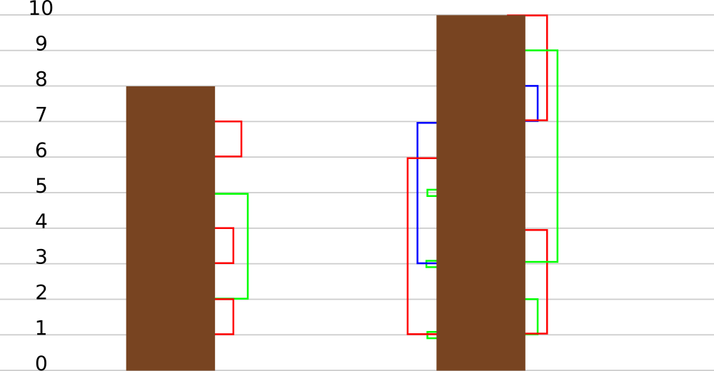 Игорь заметил, что иногда Юля пытается подняться по стволу дерева, однако не может этого сделать, так как ствол гладкий. Чтобы помочь улитке, он подвесил на это дерево нитки, прицепив нижний конец i-й нитки на высоте li над землей, а верхний — на высоте ri.