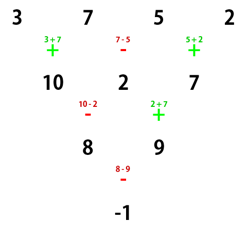 Заметьте, что, если она закончила предыдущий ряд, вычислив сумму чисел, то она должна начать новый ряд вычитанием, и наоборот.