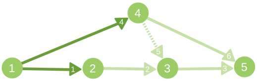 Иллюстрация к примеру из условия. Темным обозначены насыщенные ребра, пунктиром — ребро, по которому не идет поток (gi = 0). Число на ребре — номер данного ребра в списке.