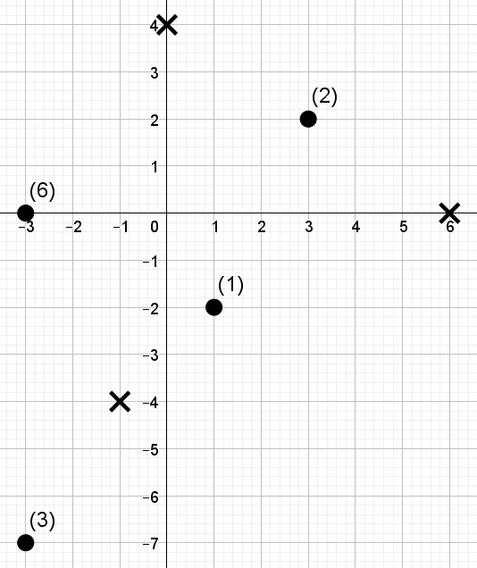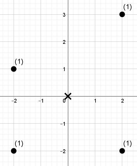 Изображения, относящиеся к тестам из условия, даны ниже. Варианты местоположения выставки отмечены крестиками, а фабрики точками. Рядом с каждой фабрикой указано количество автомобилей, находящихся на ней.