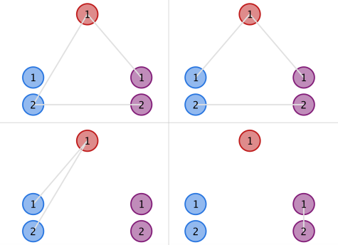 Мосты были построены между некоторыми парами островов. Возможно, что все пары островов соединены мостами или же нет ни одного моста. Мост соединяет два различных острова и имеет длину 1. По мосту можно перемещаться в обе стороны. Для каждой пары различных островов одного цвета должно быть выполнено, что расстояние между ними по мостам не менее 3 или же невозможно добраться с одного острова до другого по мостам.