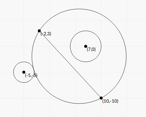 Выведите такое минимальное вещественное число, что возможно провести окружность через заданные точки, не пересекающие заданные окружности.