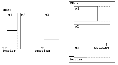 На картинке выше видно каким образом виджеты упаковываются в HBox и VBox. При этом HBox и VBox автоматически меняют свой размер в зависимости от размеров вложенных виджетов. Сами HBox и VBox отличаются только тем, что в HBox виджеты упаковываются по горизонтали, а в VBox — по вертикали. При этом параметр spacing задает расстояние между соседними виджетами, а border — рамку вокруг всех вложенных виджетов нужной ширины. Вложенные виджеты располагаются ровно в том порядке, в котором для них был вызван метод pack(). Если внутри HBox или VBox нет ни одного вложенного виджета, то их размеры равны 0 × 0 вне зависимости от параметров border и spacing.