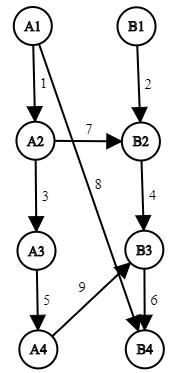 Для каждого i (1 ≤ i < n) существует ориентированное ребро из Ai в Ai + 1, а также из Bi в Bi + 1. Пропускные способности этих рёбер заданы во входных данных. Также может быть несколько рёбер, ведущих из A в B (но нет таких рёбер, которые ведут из B в A).