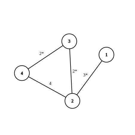 Последовательность вершин в кратчайшем пути: {1, 2, 3, 4}. Рёбра минимального остовного дерева обозначены звёздочкой (*).