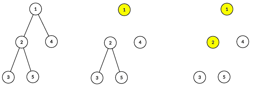 В первом примере сначала нужно уничтожить вершину с номером 1 (при ее уничтожении удалятся ребра (1, 2) и (1, 4)), затем 2-ю (удаляются ребра (2, 3) и (2, 5)). После этого в дереве не остается ребер, поэтому оставшиеся вершины можно уничтожать в любом порядке.