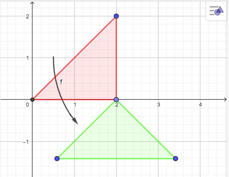 Красный треугольник обозначает начальное состояние, а зелёный — треугольник после поворота вокруг \((2,0)\).