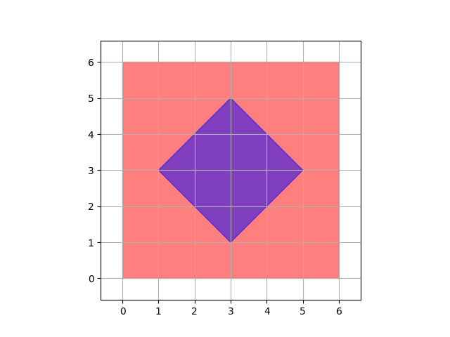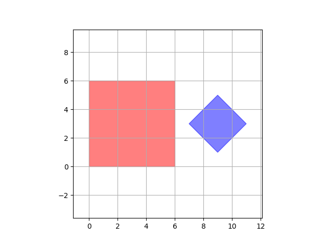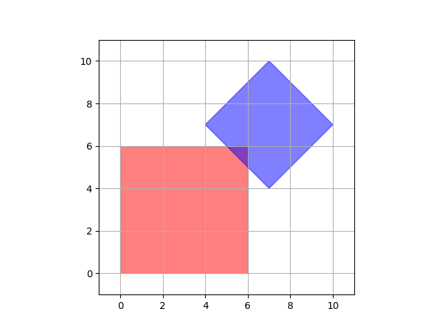 Вам даны два квадрата: один со сторонами параллельными осям координат, и один со сторонами под углом 45 градусов к осям координат. Определите, пересекаются ли квадраты.