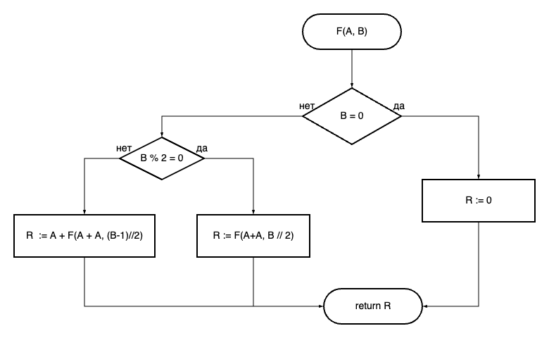 Дана блок-схема алгоритма F(A, B)