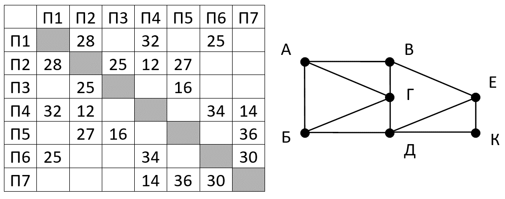 На рисунке справа схема дорог Н-ского района изображена в виде графа, в таблице содержатся сведения о длинах этих дорог (в километрах). Так как таблицу и схему рисовали независимо друг от друга, то нумерация населённых пунктов в таблице никак не связана с буквенными обозначениями на графе. Определите, какова длина дороги из пункта В в пункт Е. В ответе запишите целое число – так, как оно указано в таблице.