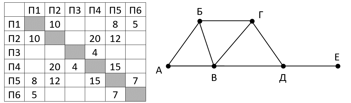 На рисунке справа схема дорог Н-ского района изображена в виде графа, в таблице содержатся сведения о длинах этих дорог (в километрах). Так как таблицу и схему рисовали независимо друг от друга, то нумерация населённых пунктов в таблице никак не связана с буквенными обозначениями на графе. Определите длину кратчайшего пути между пунктами А и Б. Передвигаться можно только по указанным дорогам.