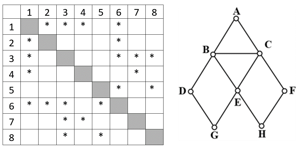(Е. Джобс) На рисунке справа схема дорог Н-ского района изображена в виде графа, в таблице звёздочками обозначено наличие дорог. Так как таблицу и схему рисовали независимо друг от друга, то нумерация населённых пунктов в таблице никак не связана с буквенными обозначениями на графе. Найдите номера пунктов G и H и запишите их в ответе в порядке возрастания без разделителей.