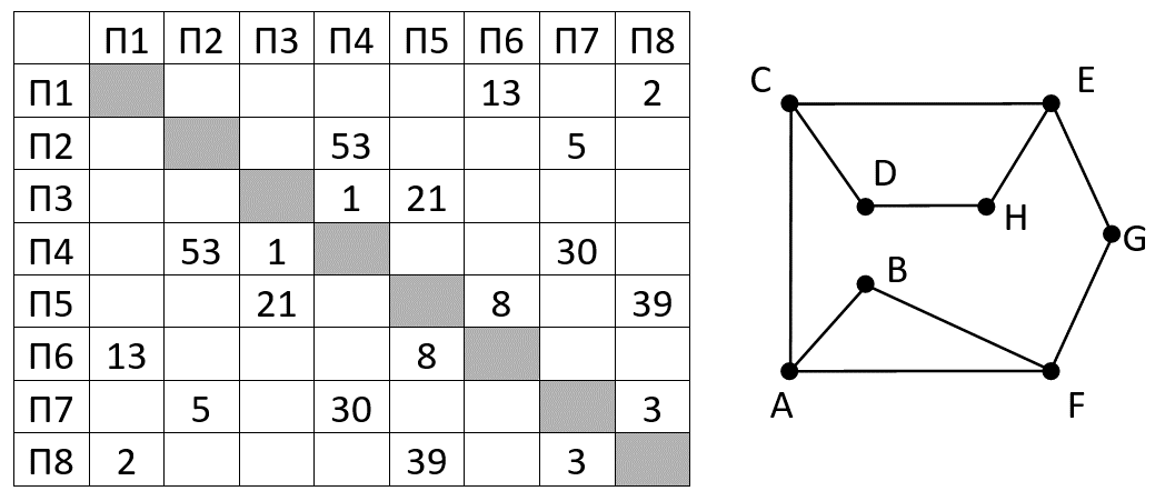 (ЕГЭ-2022) На рисунке схема дорог Н-ского района изображена в виде графа, в таблице содержатся данные о протяженности дорог между населёнными пунктами (в километрах). Так как таблицу и схему рисовали независимо друг от друга, то нумерация населённых пунктов в таблице никак не связана с буквенными обозначениями на графе. Определите, какова сумма протяженностей дорог из пункта A в пункт B и из пункта H в пункт D.