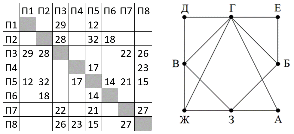 (И. Карпачёв) На рисунке справа схема дорог Н-ского района изображена в виде графа, в таблице содержатся сведения о длинах этих дорог (в километрах). Так как таблицу и схему рисовали независимо друг от друга, то нумерация населённых пунктов в таблице никак не связана с буквенными обозначениями на графе. В таблице в левом столбце указаны номера пунктов, откуда совершается движение, в первой строке – куда. Определите сумму длин дорог ВД, ГЕ и ЗЖ. Передвигаться можно только по указанным дорогам.