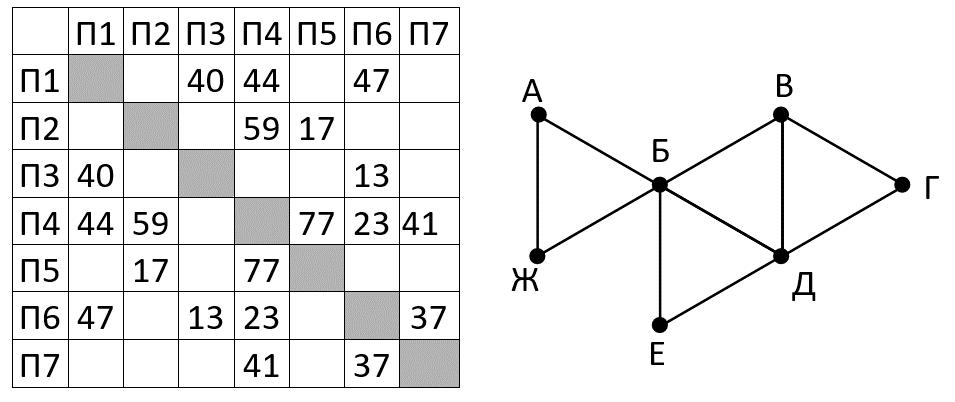 (А. Богданов) На рисунке справа схема дорог Н-ского района изображена в виде графа, в таблице содержатся сведения о длинах этих дорог (в километрах). Так как таблицу и схему рисовали независимо друг от друга, то нумерация населённых пунктов в таблице никак не связана с буквенными обозначениями на графе. В таблице в левом столбце указаны номера пунктов, откуда совершается движение, в первой строке – куда.