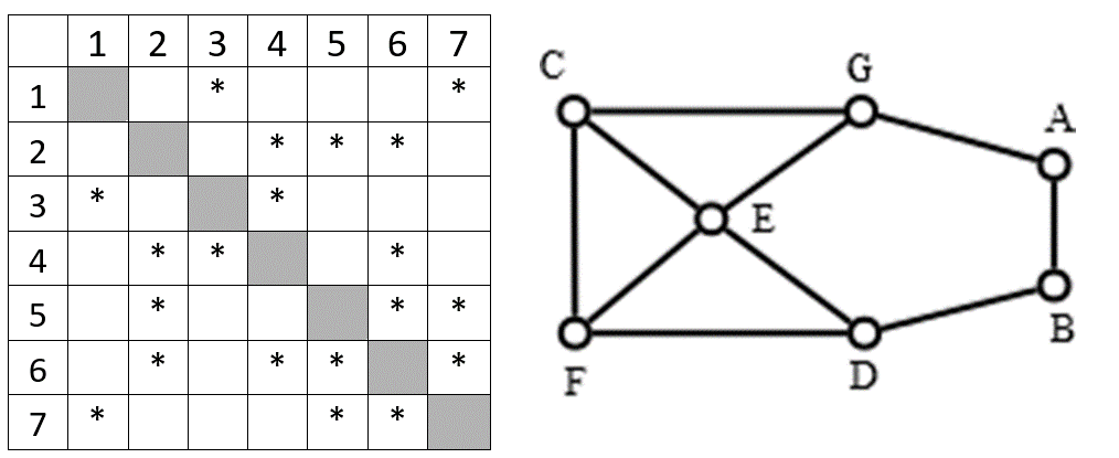 (ЕГЭ-2023) На рисунке справа схема дорог Н-ского района изображена в виде графа, звёздочка в ячейке таблицы обозначает наличие дороги между двумя пунктами. Так как таблицу и схему рисовали независимо друг от друга, то нумерация населённых пунктов в таблице никак не связана с буквенными обозначениями на графе.