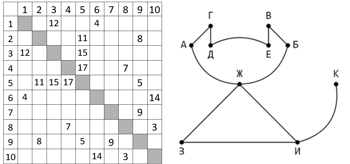 (И. Карпачев) На рисунке справа схема дорог Н-ского района изображена в виде графа, в таблице содержатся сведения о длинах этих дорог (в километрах).Так как таблицу и схему рисовали независимо друг от друга, то нумерация населённых пунктов в таблице никак не связана с буквенными обозначениями на графе.