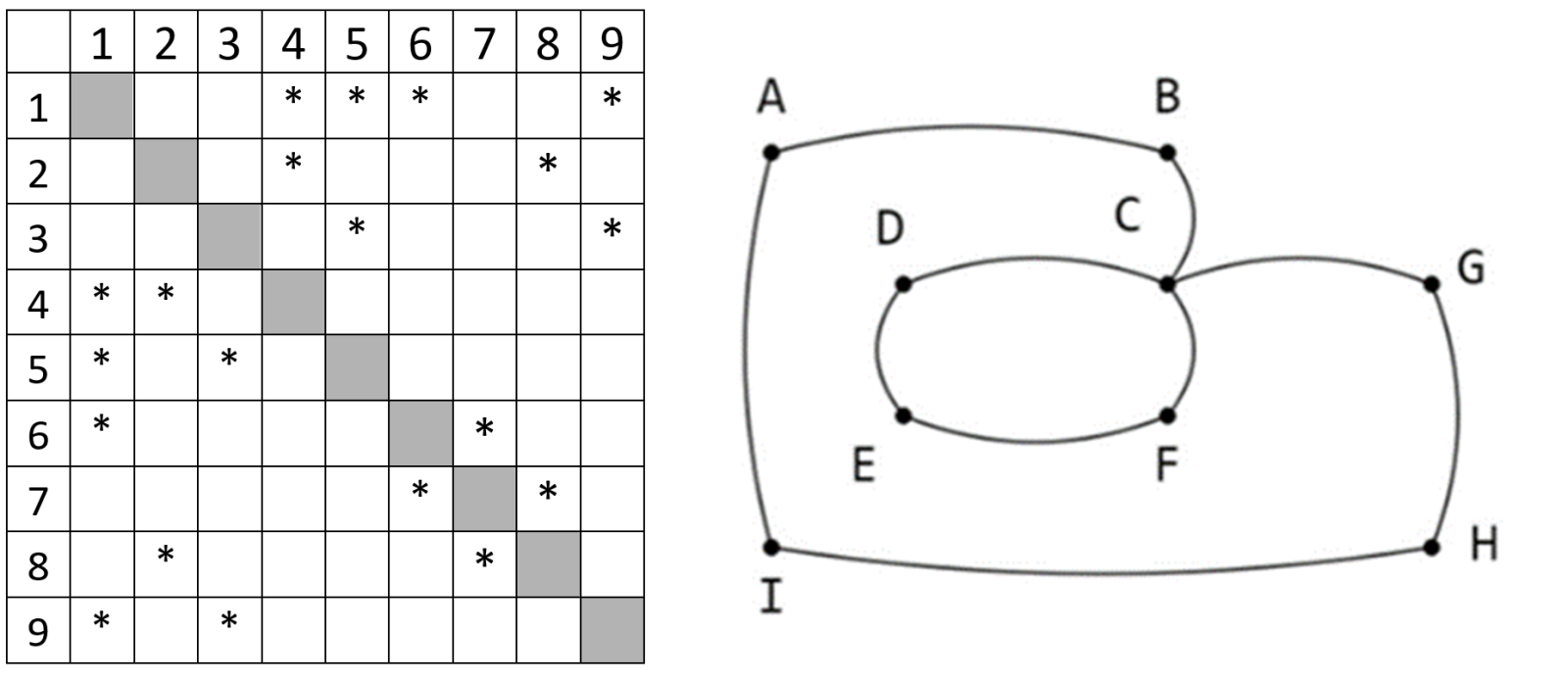 (И. Карпачев) На рисунке справа схема дорог Н-ского района изображена в виде графа, звёздочка в ячейке таблицы обозначает наличие дороги между двумя пунктами. Так как таблицу и схему рисовали независимо друг от друга, то нумерация населённых пунктов в таблице никак не связана с буквенными обозначениями на графе.