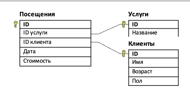 (М. Шагитов) В файле 3-138.xls представлен фрагмент базы данных «Фитнес-клуб», содержащий данные о предоставляемых услугах и посещениях клиентами. База данных состоит из трёх таблиц. Таблица «Посещения» содержит записи о посещениях различных услуг фитнес-клуба, а также информацию о дате, времени и стоимости каждого посещения. Таблица «Услуги» содержит информацию о характеристиках каждой услуги. Таблица «Клиенты» содержит данные о клиентах клуба. На рисунке приведена схема указанной базы данных.