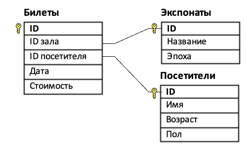 (М. Шагитов) В файле 3-139.xls представлен фрагмент базы данных «Музей» о залах музея, посетителях и приобретенных билетах. База данных состоит из трёх таблиц. Таблица «Билеты» содержит записи о приобретенных билетах на просмотр различных залов, а также информацию о дате каждого посещения. Таблица «Экспонаты» содержит информацию о характеристиках каждого экспоната. Таблица «Посетители» содержит данные о посетителях музея. На рисунке приведена схема указанной базы данных.