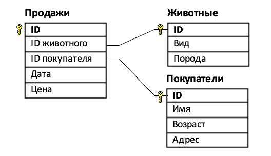 (М. Шагитов) В файле 3-140.xls представлен фрагмент базы данных «Зоомагазин» о доступных животных, покупателях и совершенных продажах. База данных состоит из трёх таблиц. Таблица «Продажи» содержит записи о проданных животных различным покупателям, а также информацию о дате каждой продажи и финальной цене. Таблица «Животные» содержит информацию о характеристиках каждого животного. Таблица «Покупатели» содержит данные о покупателях магазина. На рисунке приведена схема указанной базы данных.