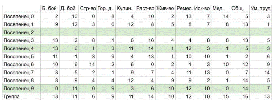 Владение тем или иным навыком группы вычисляется как максимальное из значений у поселенцев этой группы. В качестве кандидатов были представлены 10 поселенцев, таблица их способностей приведена ниже: