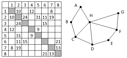 На рисунке справа схема дорог Н-ского района изображена в виде графа, в таблице содержатся сведения о длинах этих дорог (в километрах). Так как таблицу и схему рисовали независимо друг от друга, то нумерация населённых пунктов в таблице никак не связана с буквенными обозначениями на графе.