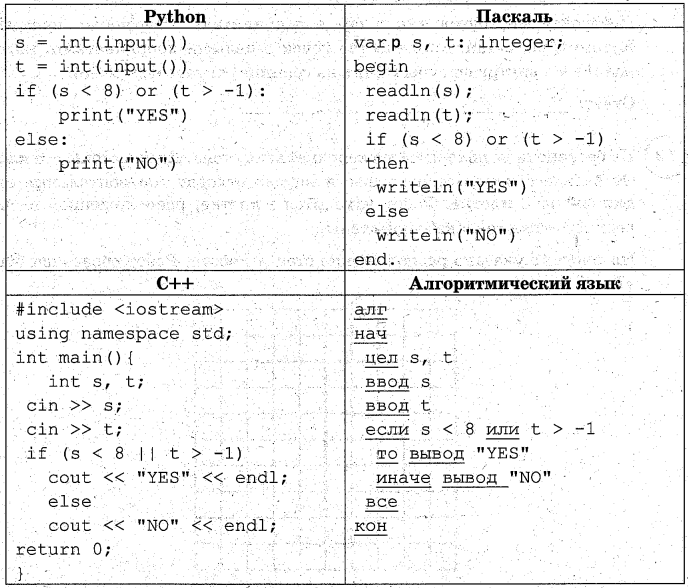 Было проведено 9 запусков программы, при которых в качестве значений переменных s и t вводились следующие пары чисел (s, t): (15, 9); (11, -7); (3, 11); (18, -15); (0, -3); (-17, 6); (17, -1); (-4; 5); (20, 0). Сколько было запусков, при которых программа напечатала "YES"?