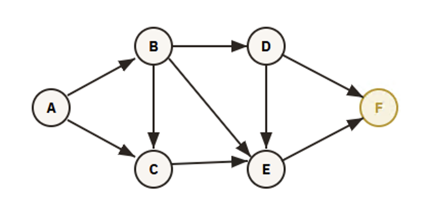 На схеме — дороги между городами A, B, C, D, E, F. Двигаться можно только по стрелкам. Сколько различных путей из A в F?