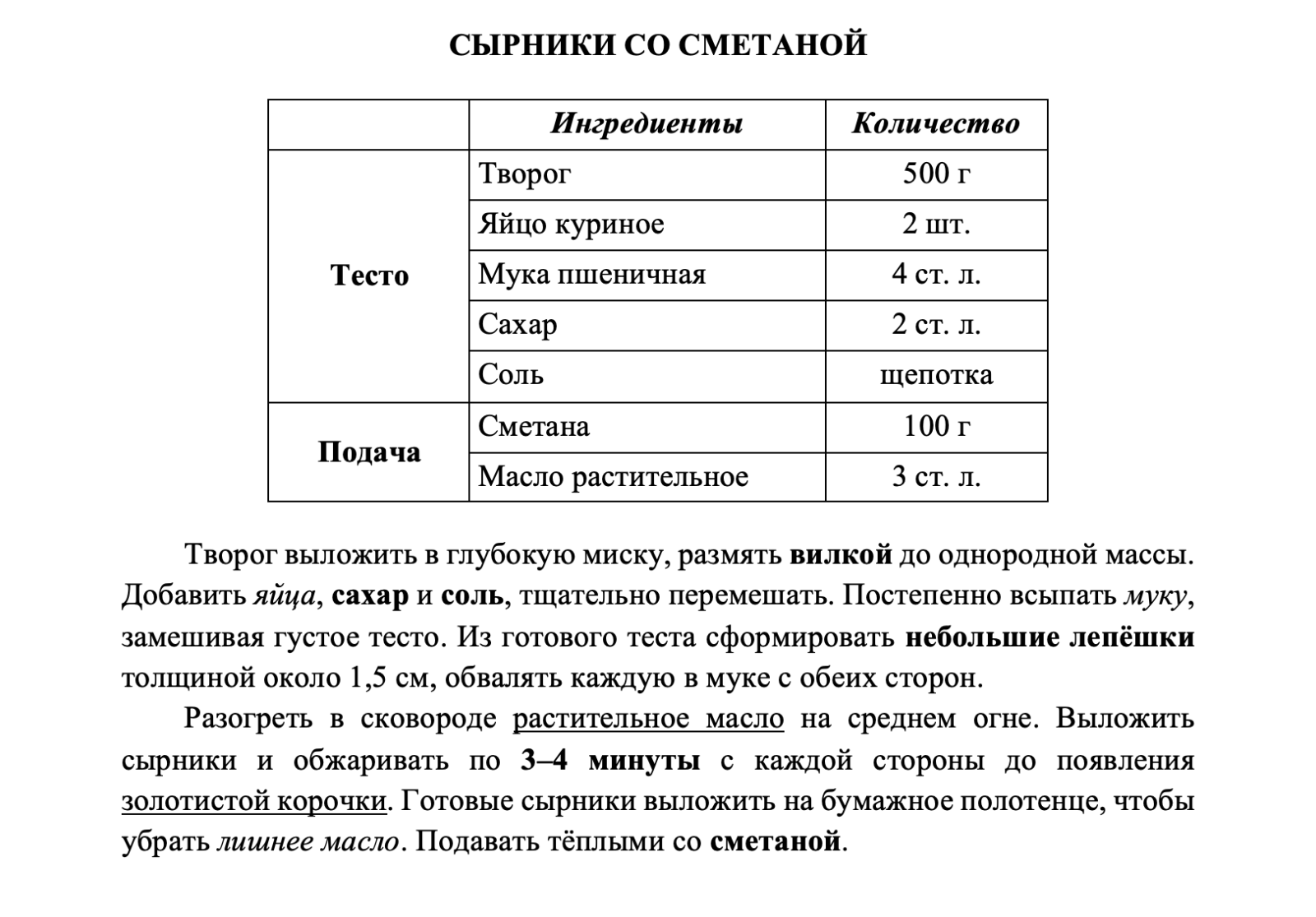 Создайте в текстовом редакторе документ и напишите в нём следующий текст, точно воспроизведя всё оформление текста, имеющееся в образце. Данный текст должен быть набран шрифтом размером 14 пунктов обычного начертания. Отступ первой строки каждого абзаца основного текста — 1 см. Расстояние между строками текста не менее высоты одинарного, но не более полуторного междустрочного интервала. Основной текст выровнен по ширине; заголовок текста — по центру. Текст в ячейках заголовка таблицы и третьего столбца таблицы — по центру. Текст в ячейках второго столбца таблицы выровнен по левому краю. Текст в ячейках первого столбца выровнен по центру. В основном тексте и таблице есть слова, выделенные полужирным шрифтом и курсивом или подчёркиванием. Таблица содержит объединённые ячейки в первом столбце. Текст в объединенных ячейках выровнен по середине по вертикали. Ширина таблицы меньше ширины основного текста. Таблица выровнена на странице по центру горизонтали.