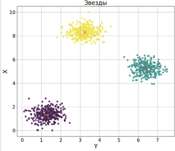 центроид, – это одна из звёзд на графике, сумма расстояний от которой до всех остальных звёзд кластера минимальна. Под расстоянием понимается расстояние Евклида между двумя точками A(x1, y1) и B(x2, y2) на плоскости, которое вычисляется по формуле: