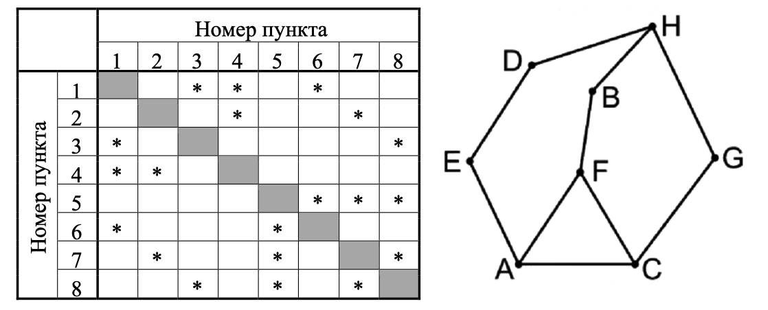 На рисунке схема дорог N-ского района изображена в виде графа, в таблице звёздочкой обозначено наличие дороги из одного населённого пункта в другой. Отсутствие звёздочки означает, что такой дороги нет.
