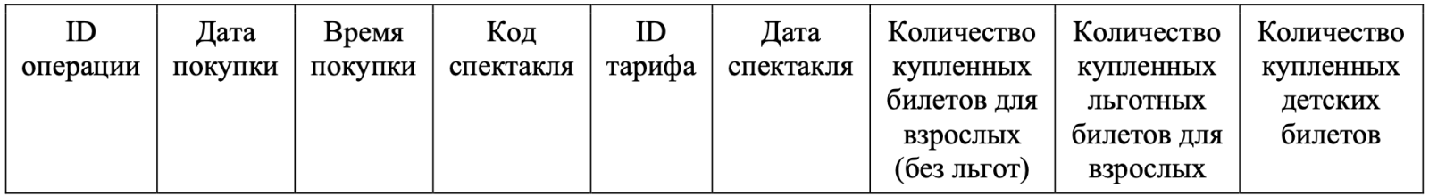 Таблица «Продажа билетов» содержит записи о количестве проданных различным категориям посетителей билетов на спектакли. Заголовок таблицы имеет следующий вид.