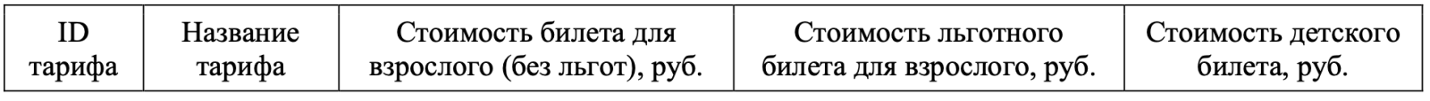 Таблица «Цены» содержит информацию о ценах на билеты в зависимости от времени и сезона. Заголовок таблицы имеет следующий вид.