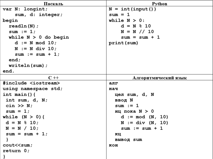 Программисту дали задание написать программу, при выполнении которой с клавиатуры считывается натуральное число N, не превосходящее 109, и выводится сумма цифр этого числа. Программист торопился и написал программу неправильно. Ниже приведён текст данной программы, написанный на четырёх языках программирования: