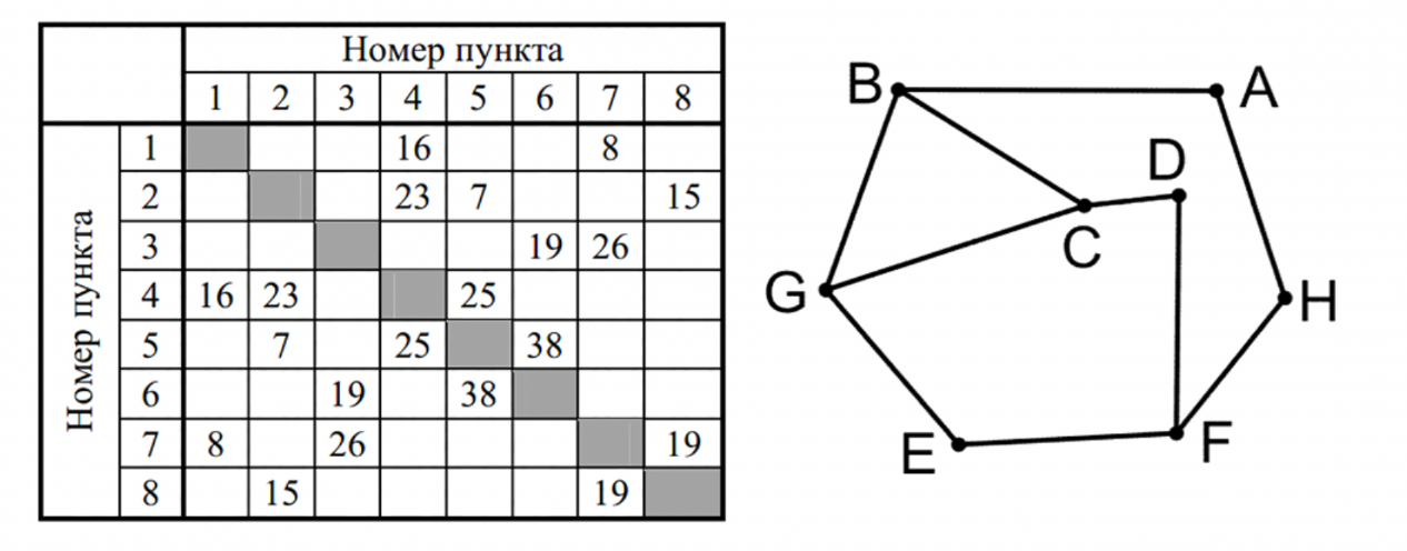 Так как таблицу и схему рисовали независимо друг от друга, нумерация населённых пунктов в таблице никак не связана с буквенными обозначениями на графе. Определите, какова сумма протяжённостей дорог из пункта B в пункт A и из пункта H в пункт A.